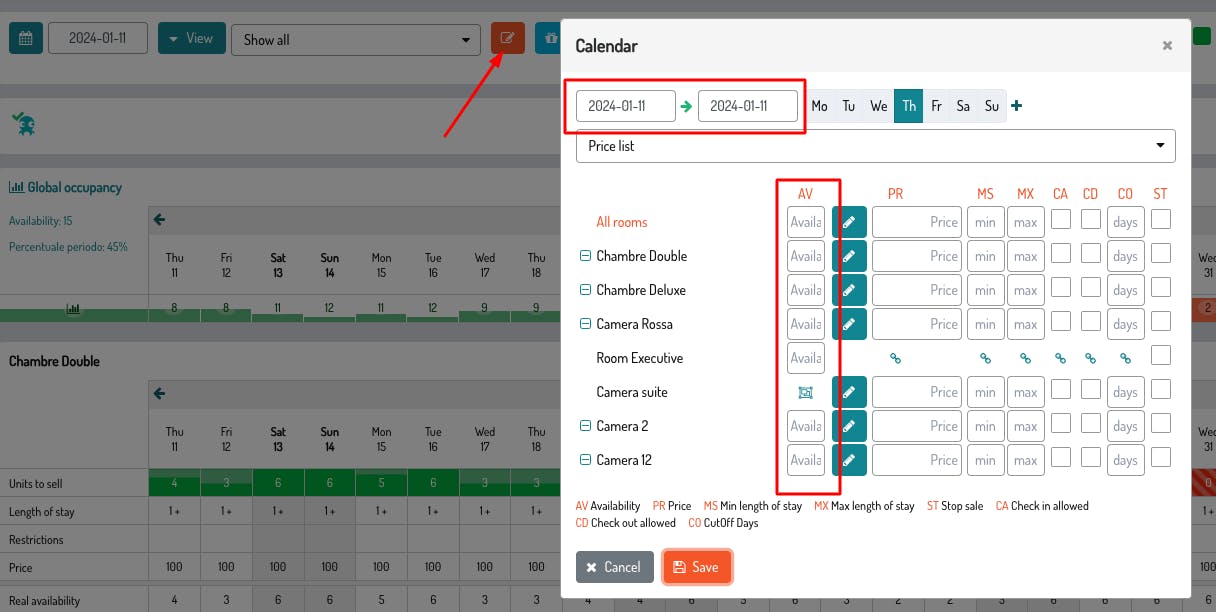 Double-cliquez directement sur la case de disponibilité de la chambre en question, correspondant au jour que vous souhaitez modifier.