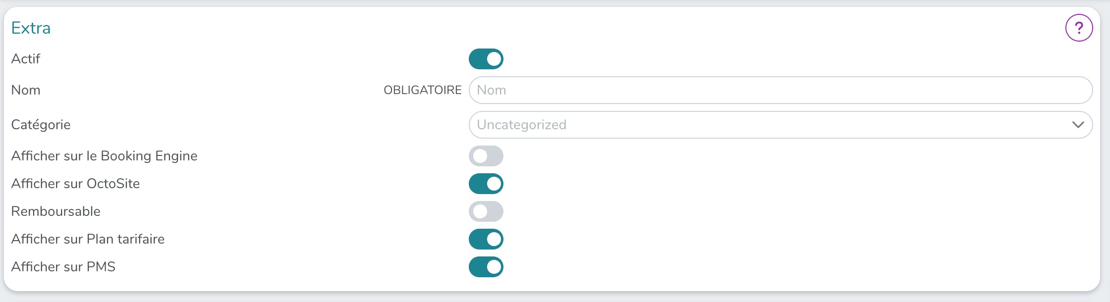 Afficher sur Plans Tarifaires: activez cette option si vous souhaitez inclure cet extra dans un plan pour créer un forfait