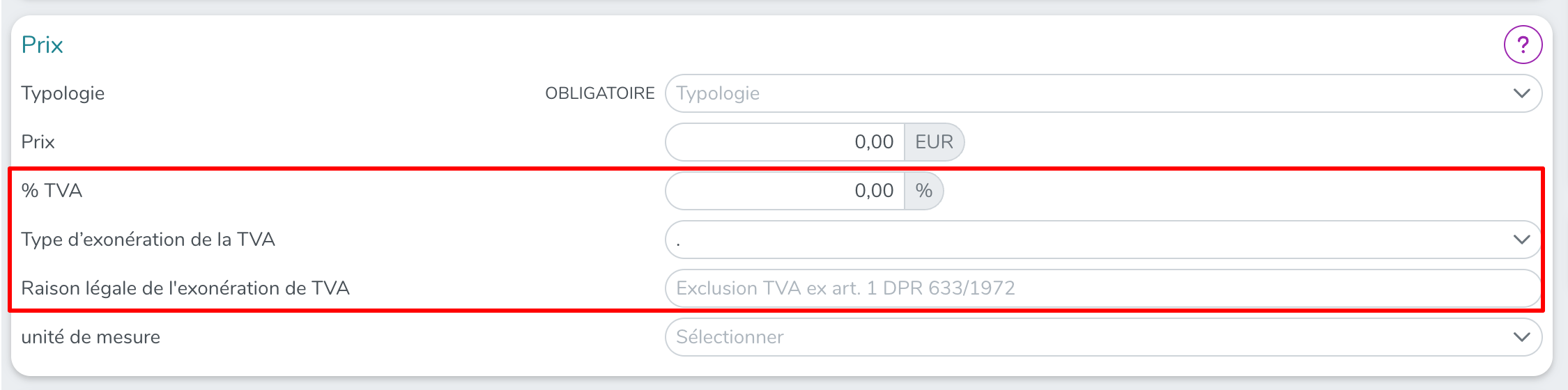 Saisissez la TVA applicable à cet extra. Si la TVA est à 0, vous pourrez aussi définir le type d’exclusion et la référence légale