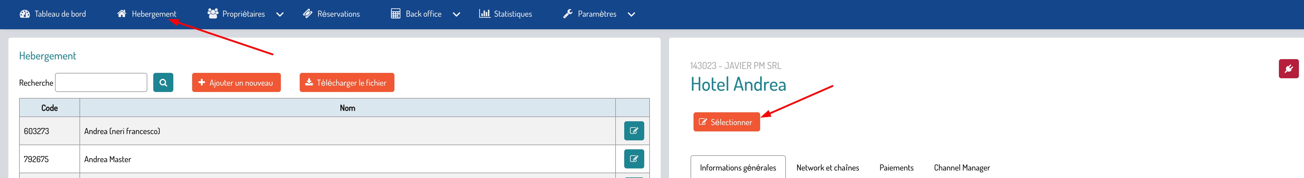 Dans la section Hebergement, vous trouverez la liste des établissements, vous pourrez cliquer sur celui qui vous intéresse, puis cliquer sur Sélectionner pour y accéder: