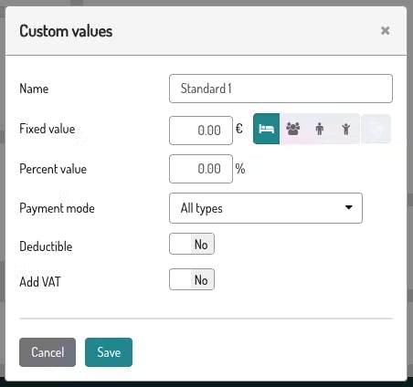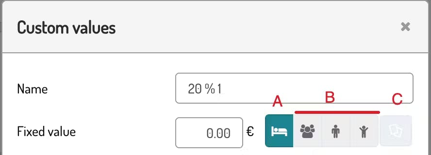 Écrivez un nom pour votre valeur personnalisée et définissez le montant. Vous pouvez d éfinir une valeur fixe par réservation (a) en fonction des hôtes (b) ou par nuit (c)