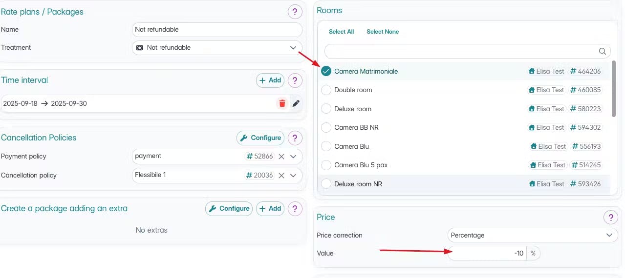 Tarif non remboursable : il sera associé à la même chambre mais dans ce cas vous devrez également renseigner la correction tarifaire que vous souhaitez appliquer :