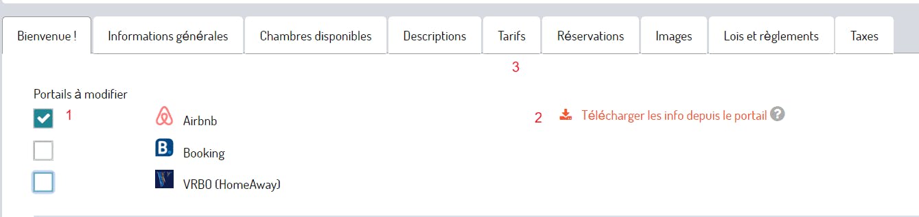 Sélectionnez Airbnb (1) , Cliquez sur "télécharger les informations du portail" (2) pour voir les informations actuellement présentes sur le portail et en fin de chargement cliquez sur Tarifs (3)