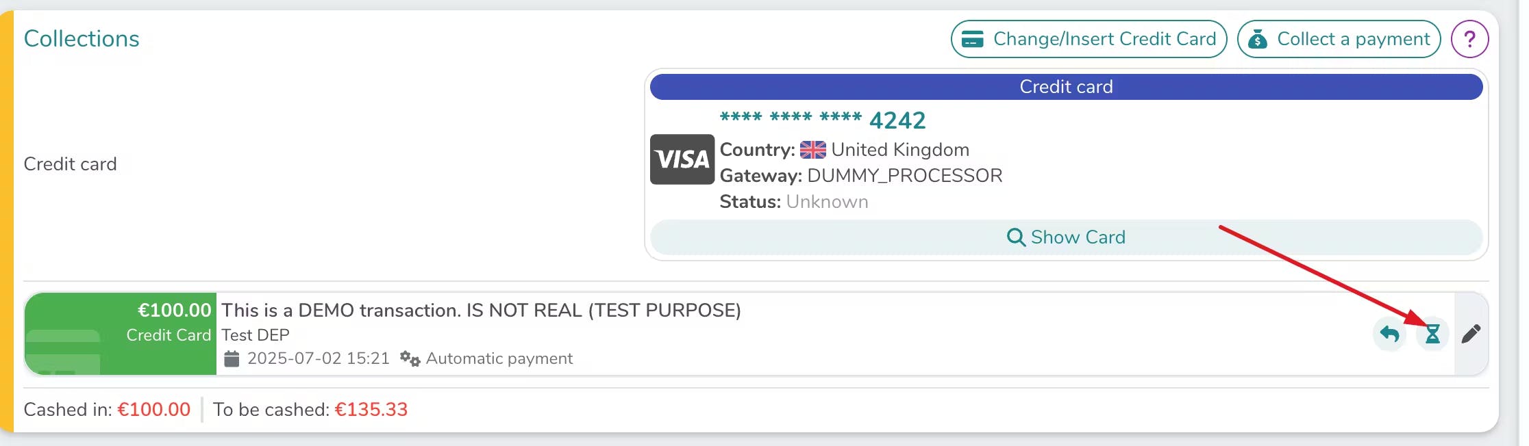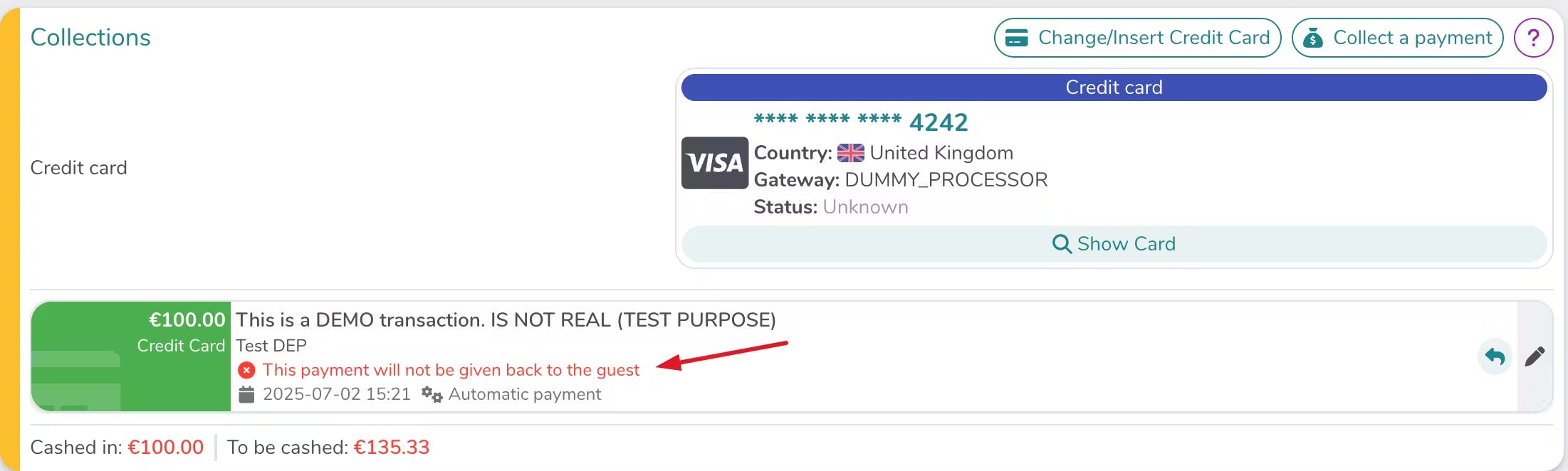 Dans la section Gestion des Paiements du détail de la réservation, une ligne de collecte dédiée sera générée et le remboursement aura lieu automatiquement après le check-out, selon le moment que vous avez défini.