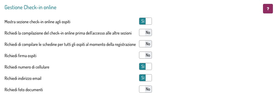 Questa opzione ti permette di scegliere se mostrare o meno la sezione per la compilazione dei dati del check-in agli ospiti.
