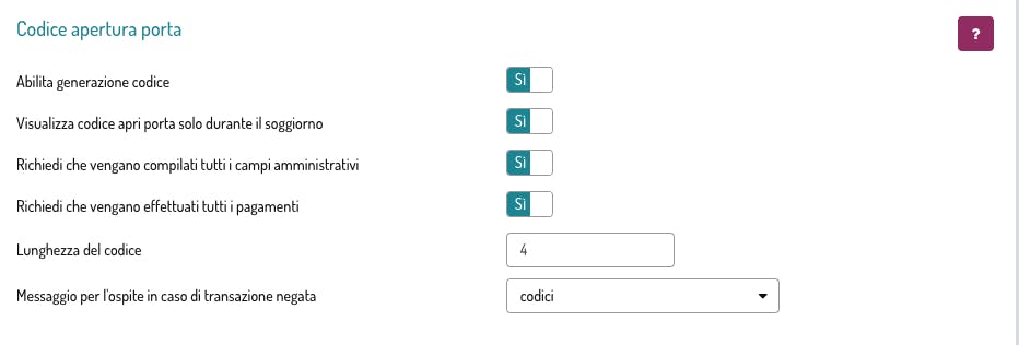 Determina in seguito la lunghezza del codice che verrà generato e il template con il quale vorrai inviarlo al cliente. Puoi anche decidere se rendere obblatoria la compilazione di tutti i campi amministrativi e/o richiedere il completamento di tutti i pagamenti prima di mostrare il codice di apertura della porta.