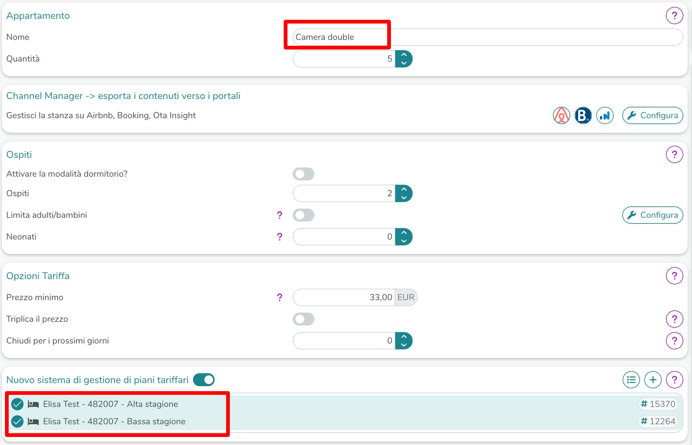 Esempio: Nella mia struttura ho una camera doppia che voglio vendere con il piano tariffario di alta o bassa stagione, a seconda del periodo.