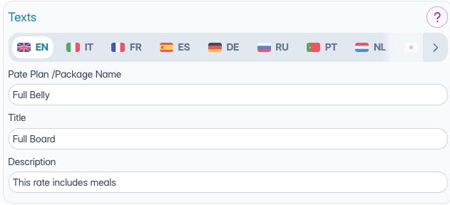 Nella sezione Testi della pagina di creazione/modifica del piano tariffario, troverai le voci Nome Piano Tariffario/Pacchetto, Titolo e Descrizione, quelle che il cliente visualizzerà sul Booking Engine in fase di prenotazione.