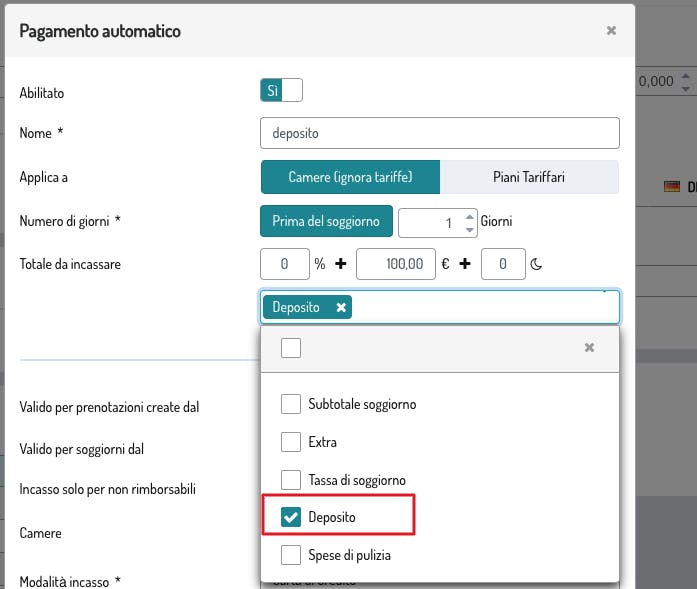 Configura l'incasso automatico definendo gli importi da addebitare e quando, potrai selezionare nello specifico la voce del Deposito come indicato nello screen qui sotto 👇