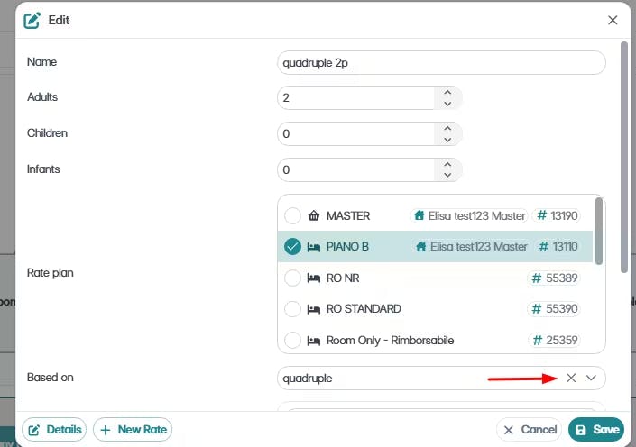 En Habitaciones > Manejar tarifas tengo mi habitación cuadruple configurada en esa manera: