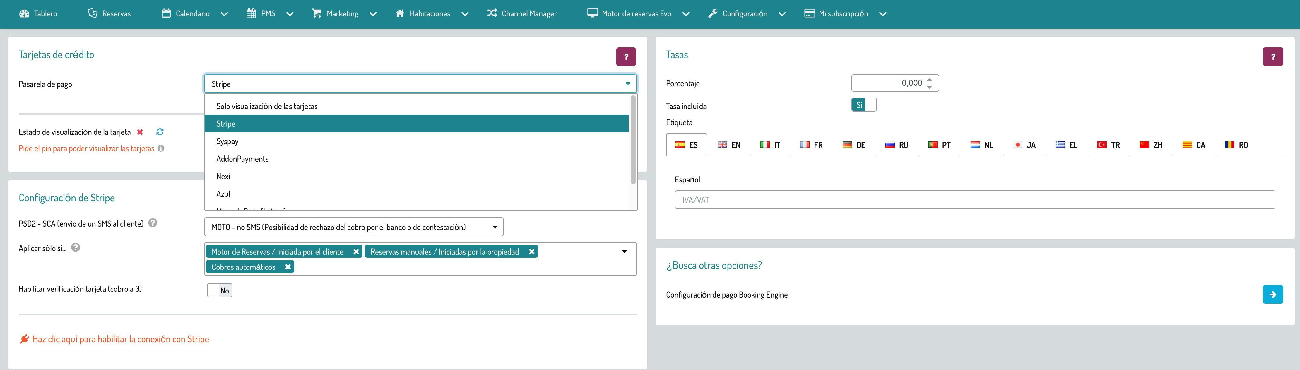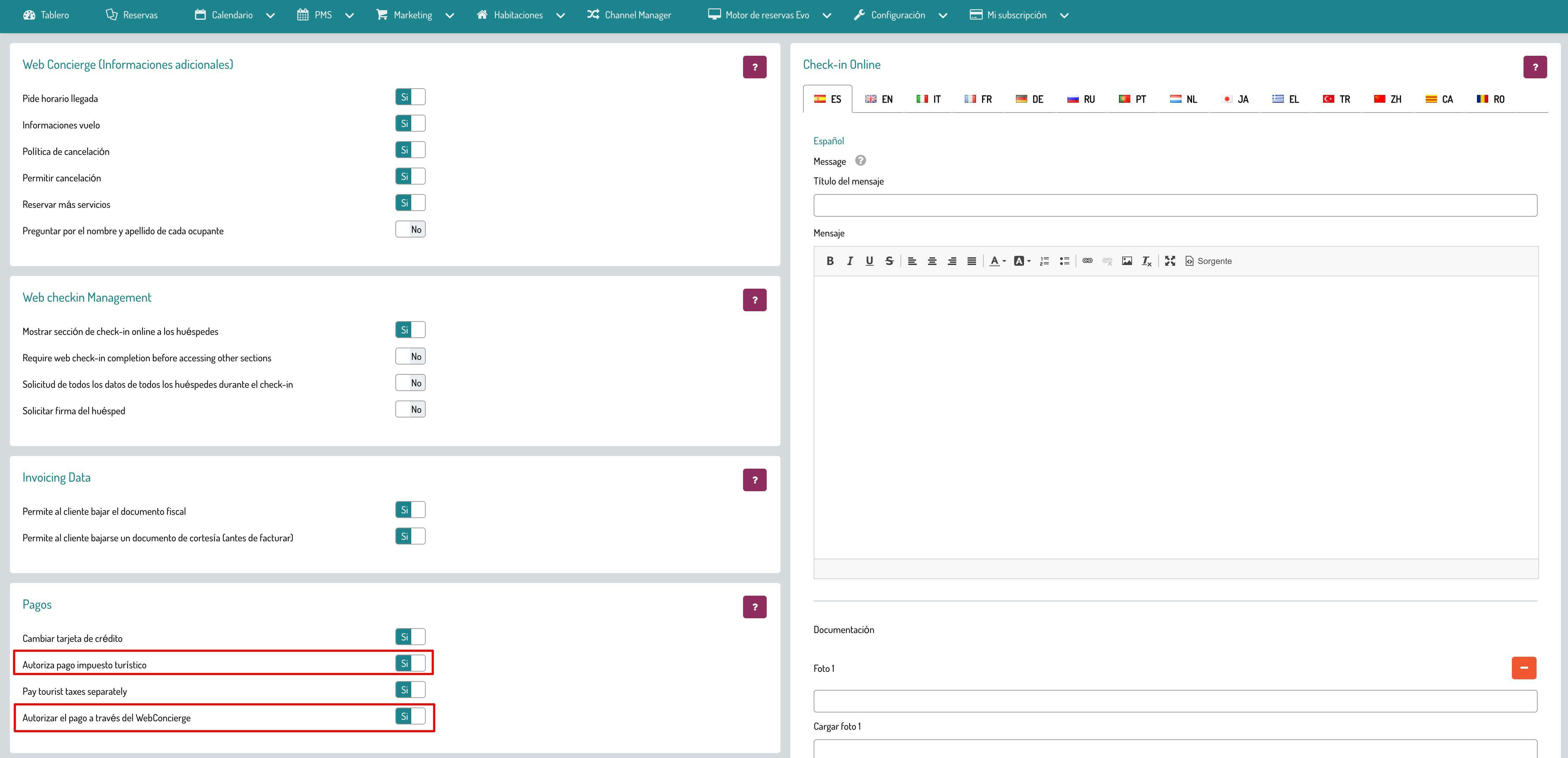 Si en tu suscripción está activo el paquete Web Concierge, puedes activar las opciones Autorizar el pago a través del Web Concierge y Autoriza pago impuesto turístico en Marketing > Web Concierge.
