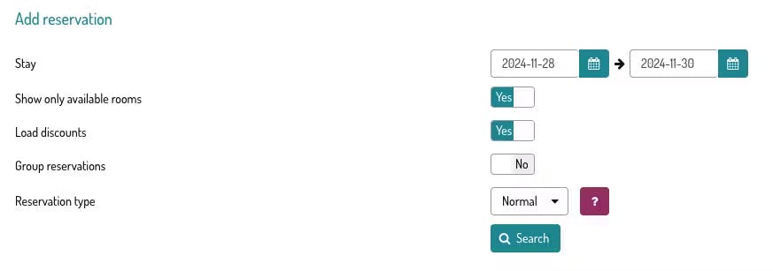 Te encontrarás en una nueva pagína en la que podrás elegir las fechas de tu interés, decidir si mostrar solo las habitaciones disponibles SI/NO en los resultados o si aplicar los descuentos creados en el motor de reservas > descuentos.