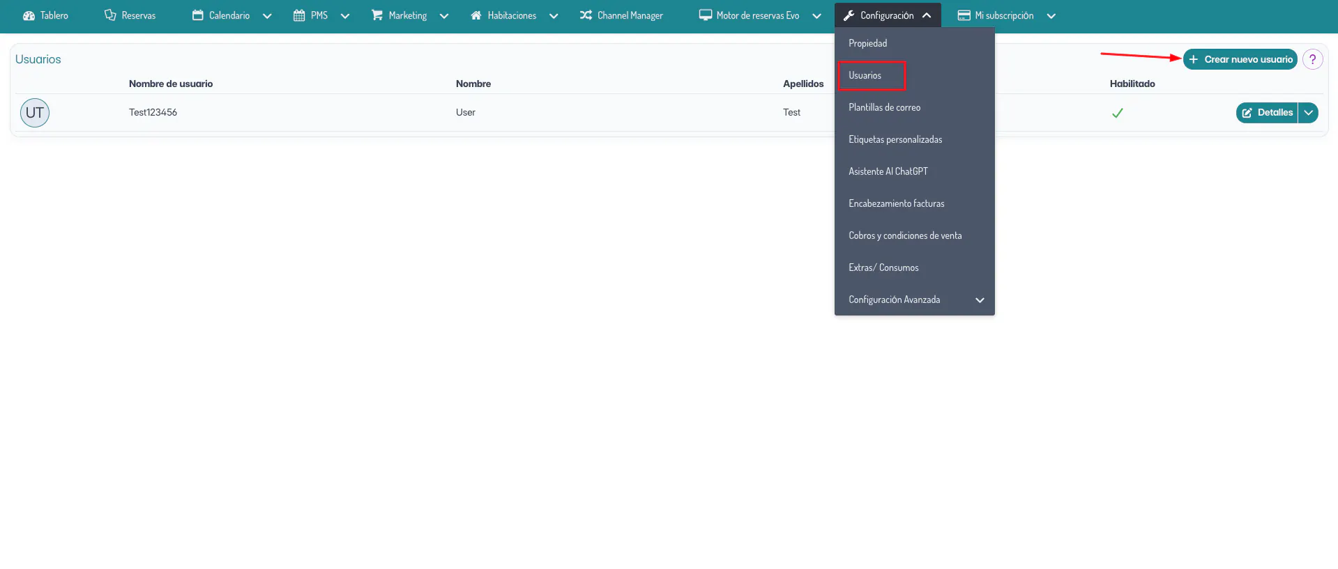 Accede a la sección Configuración > Usuarios y haz clic en el botón verde Crear Nuevo Usuario