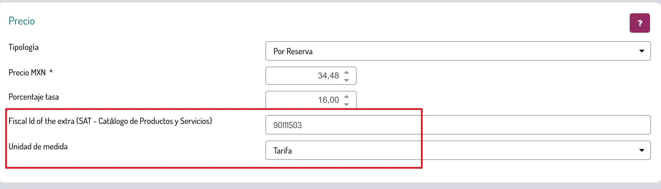 En seguida tendrás que configurar de manera correcta tus extra, poniendo el Código identificativo fiscal y la Unidad de medida.