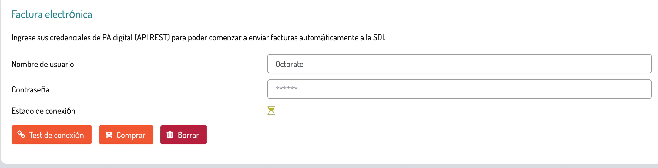 Pon tu nombre de usuario y contraseña en la sección Factura electrónica y dale a test de conexión: