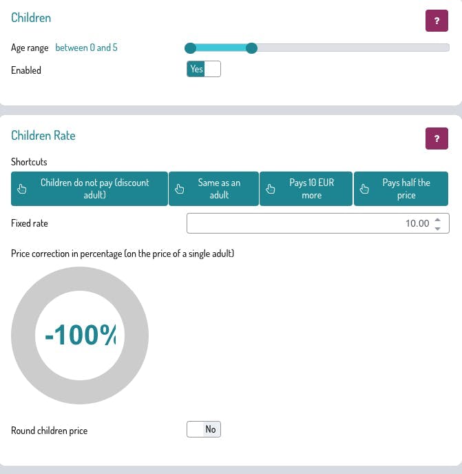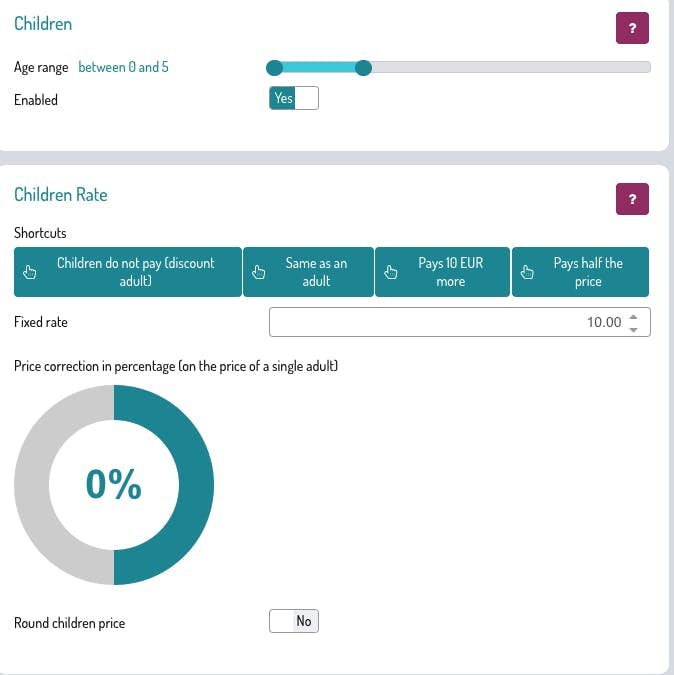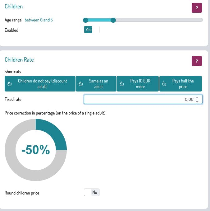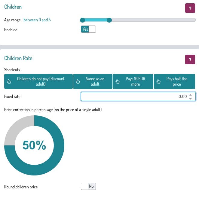 Ejemplo: Si configuras una franja para niños con un suplemento del 50%, el cálculo se hará así: precio total de la habitación : número de adultos + el 50% calculado sobre el coste de un solo adulto.