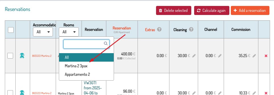 Para seleccionar las reservas que quieres incluir en el listado, haz clic en Añadir reserva: