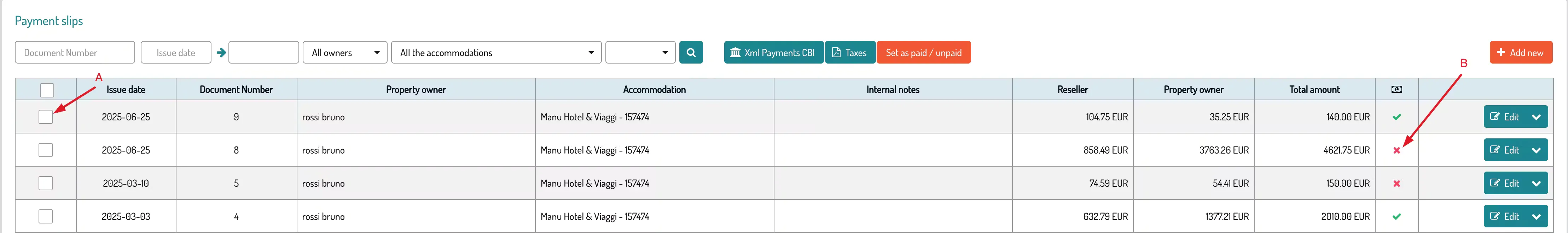 Une fois les virements effectués, vous pourrez paramétrer les bordereaux comme payés, en les sélectionnant depuis la première colonne et en cliquant sur le bouton approprié :