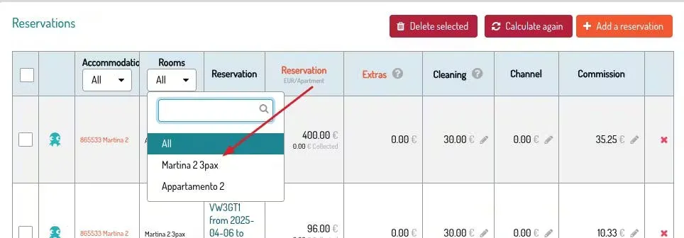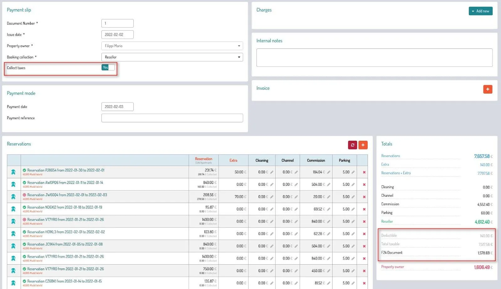 Une alternative pour la création des Détails de paiement est dans la section Propriétaires > Réservations. Vous pourrez sélectionner les réservations qui vous intéressent et émettre un Détail de paiement du bouton correspondant, en suivant les mêmes étapes décrites plus haut.